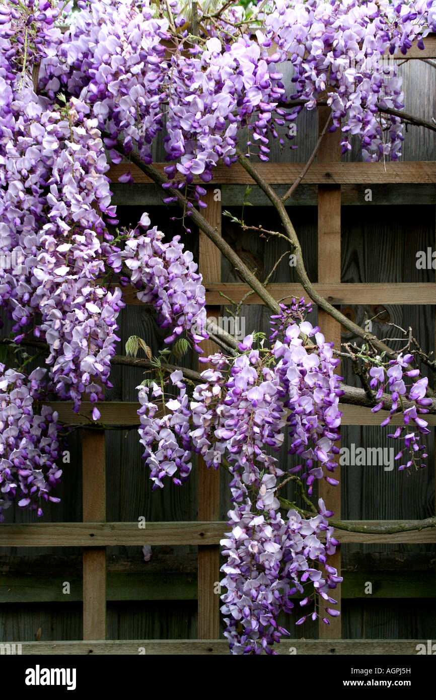 Wisteria In Full Bloom Growing On Trellis In Small Garden Stock