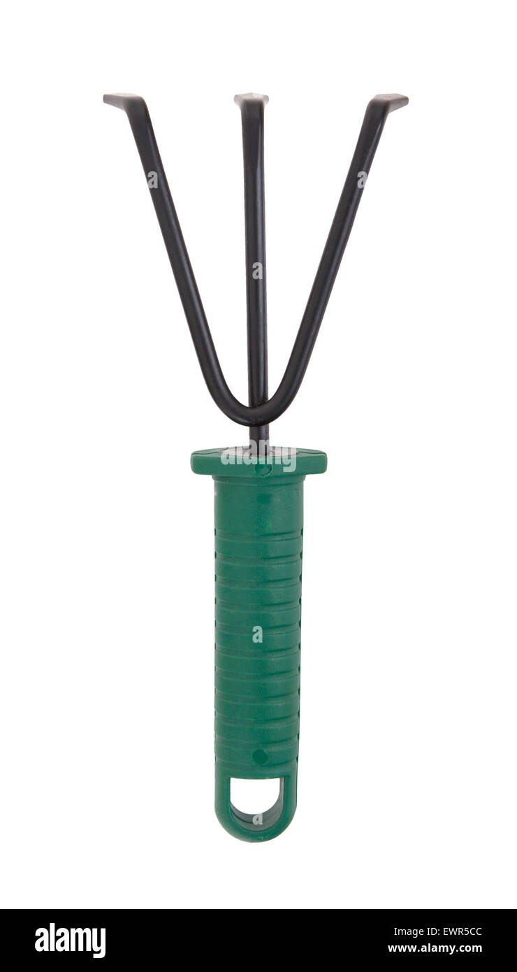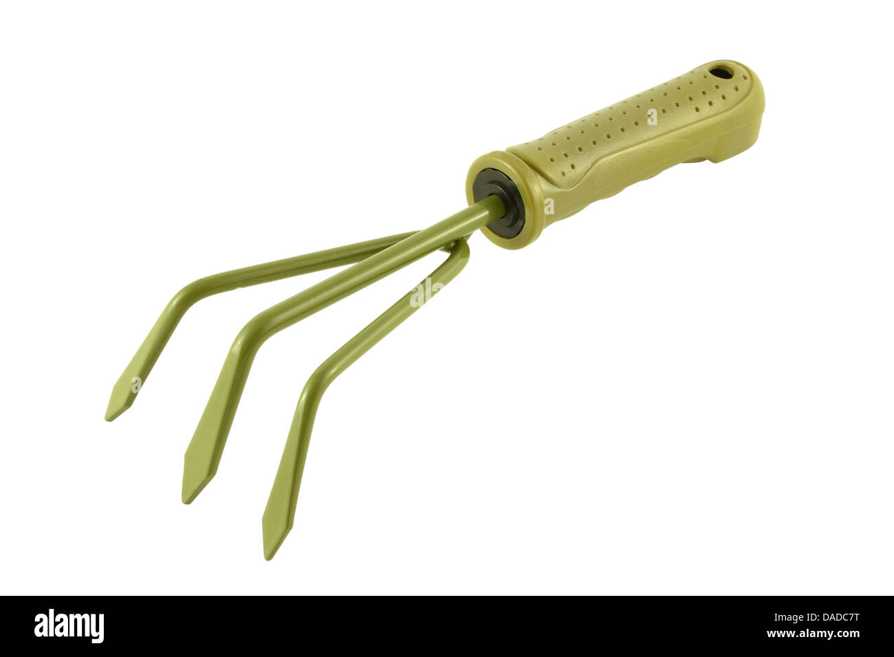 Small Rake Gardening 5 Teeth With Green Handle On White Background