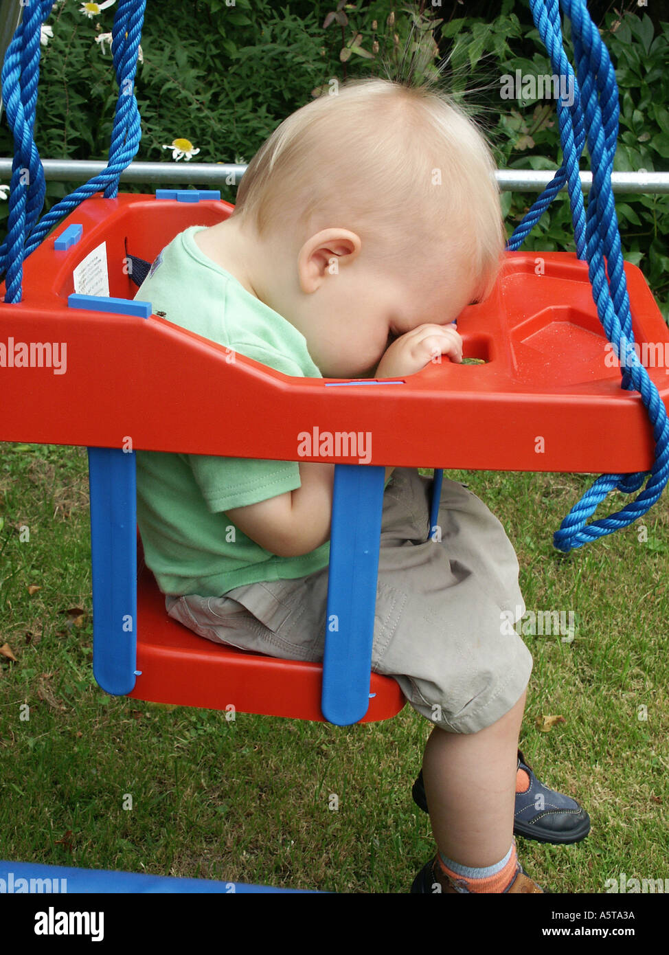 Small Boy Asleep In A Red Garden Swing Stock Photo 2116153 Alamy