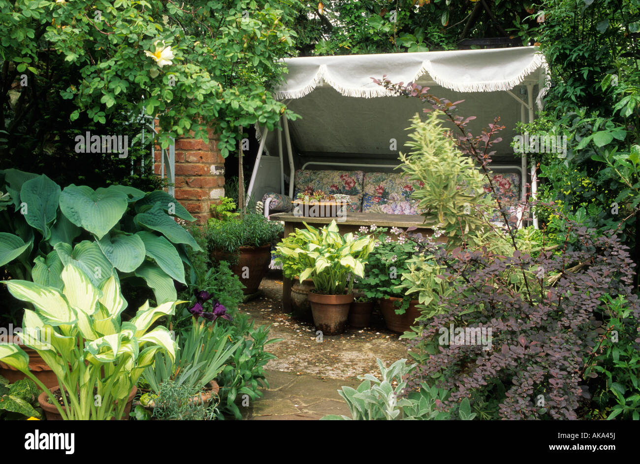 Private Garden Surrey Swing Seat In Small Town Garden Stock Photo