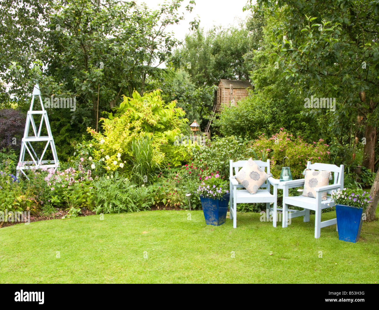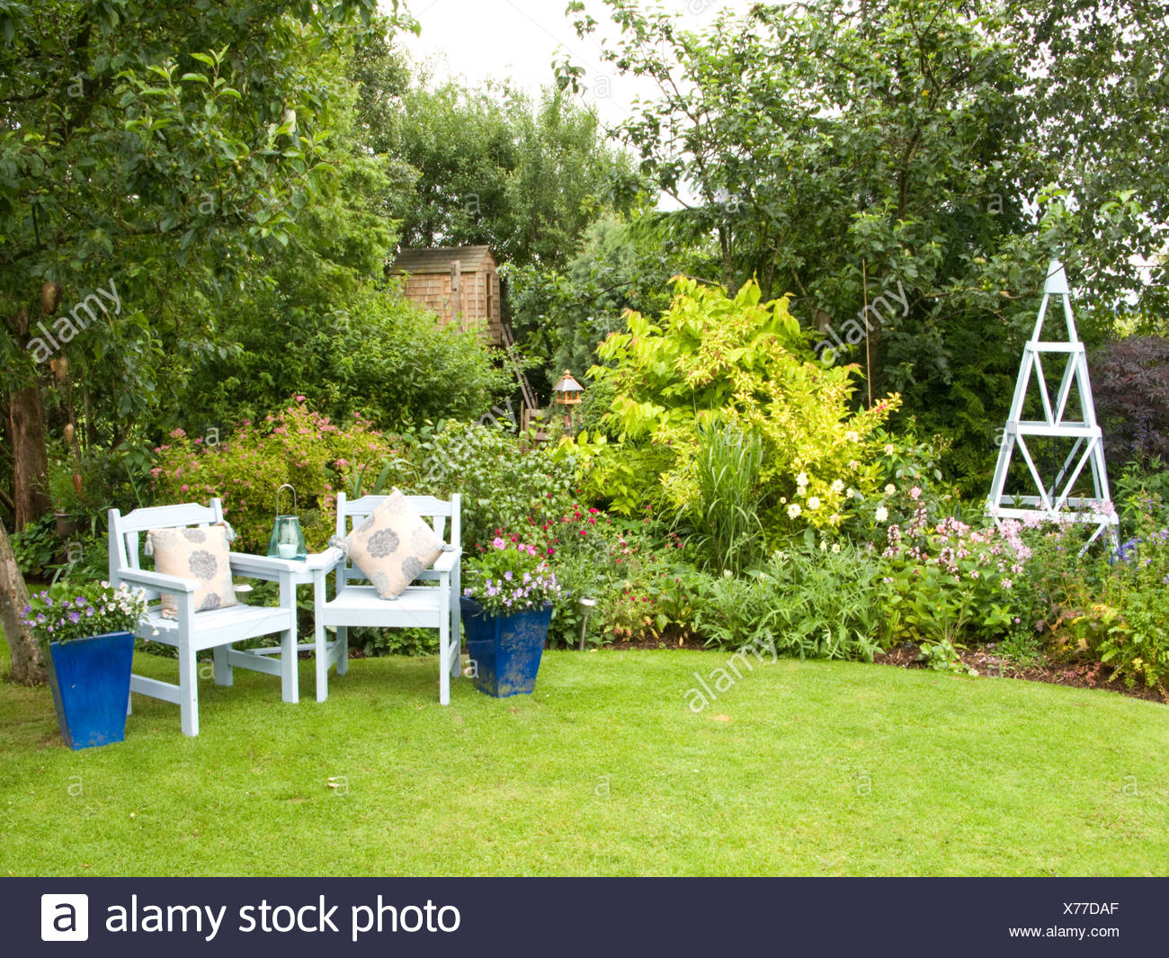 Small Garden With Obelisk And Two Garden Chairs Stock Photo