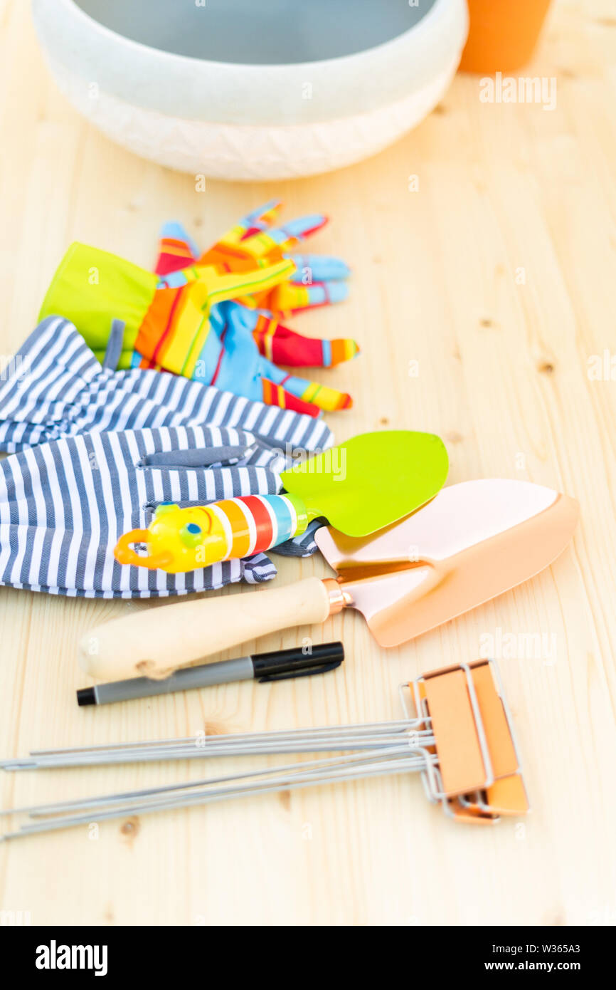 Small Garden Tools With Some Spilled Soil On The Wooden Table