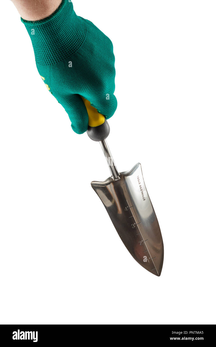 Small Garden Trowel In Hand Dressed In A Green Glove Isolated On