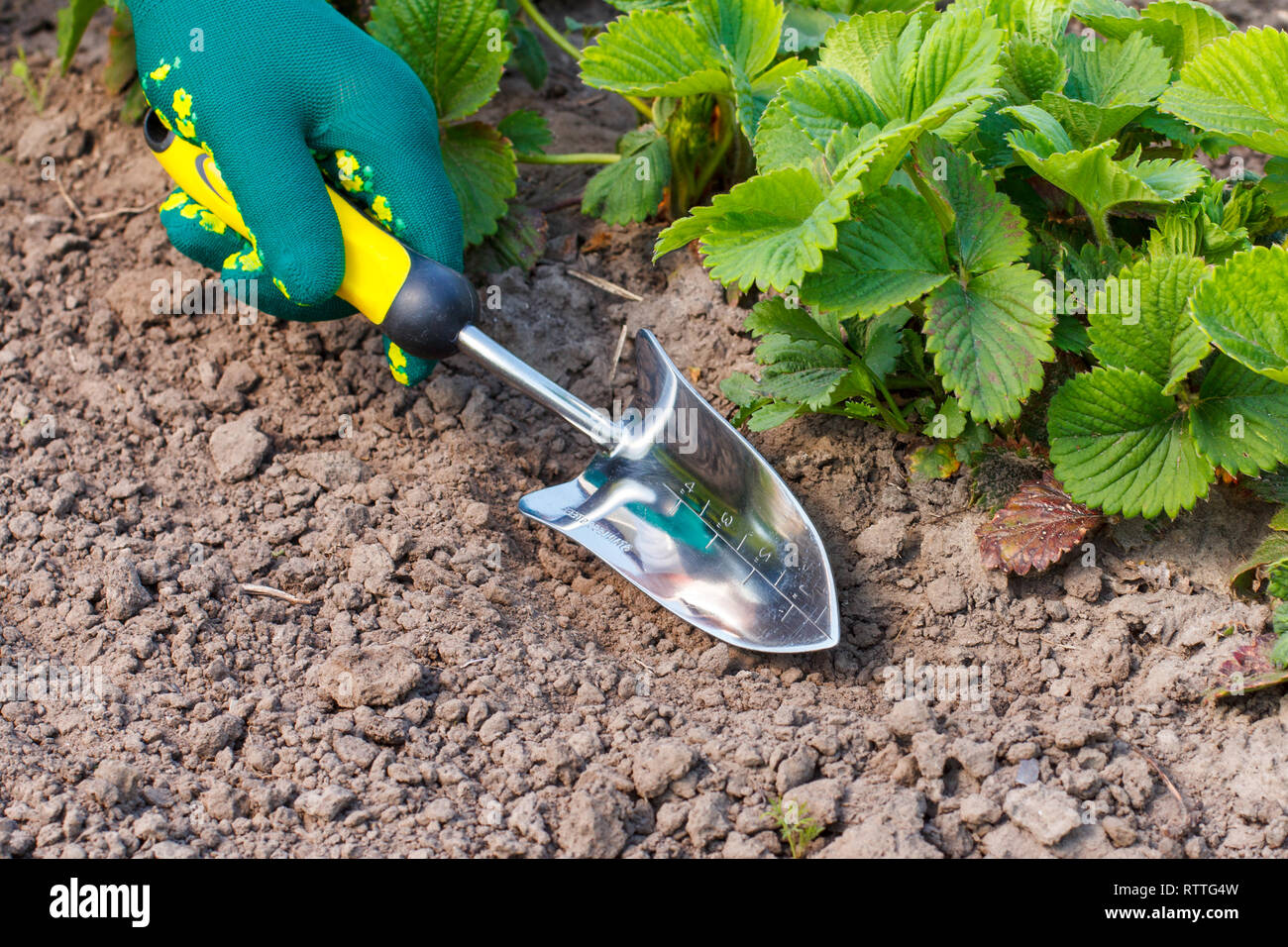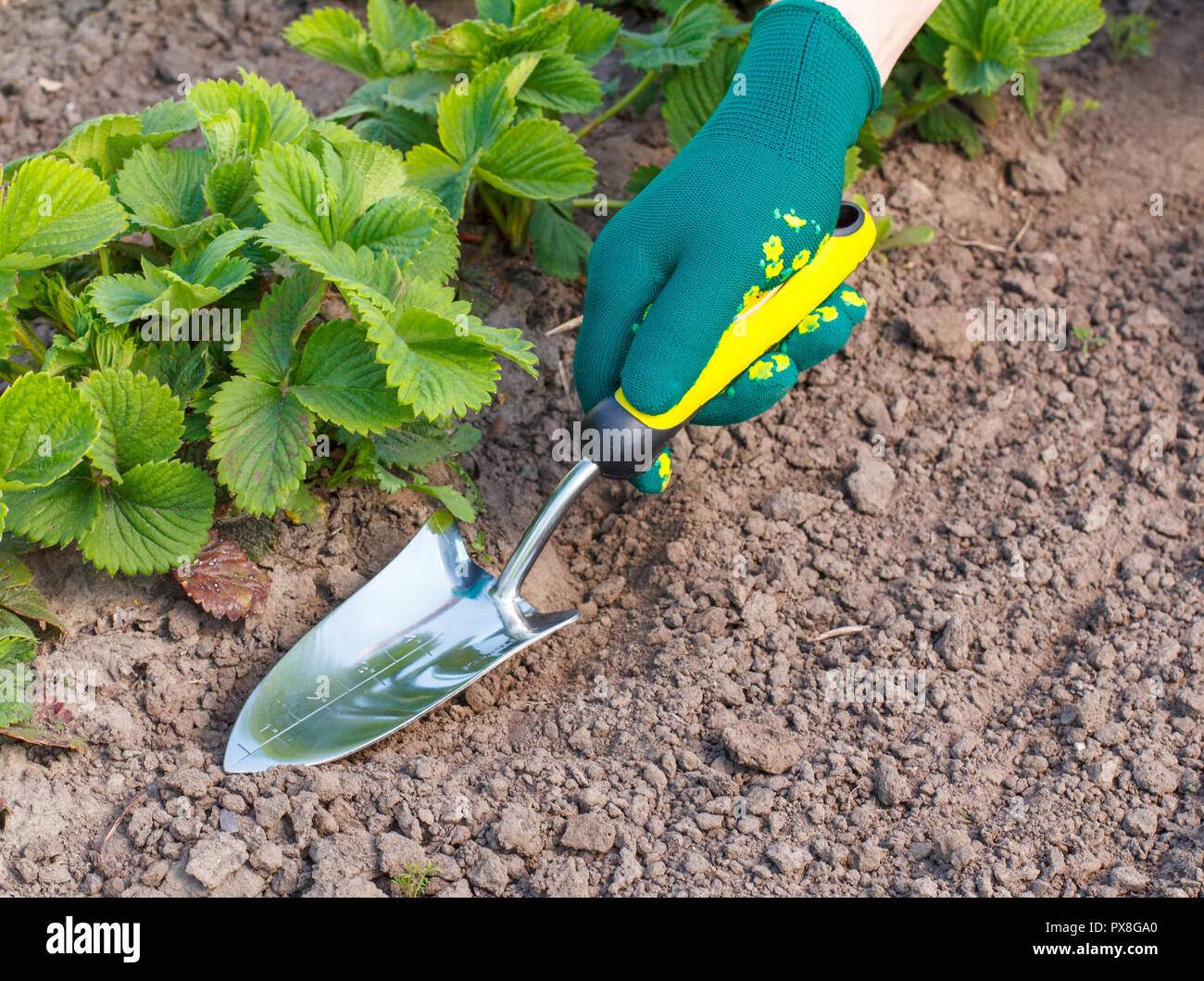 Small Hand Garden Trowel In Hand Dressed In A Green Glove Is