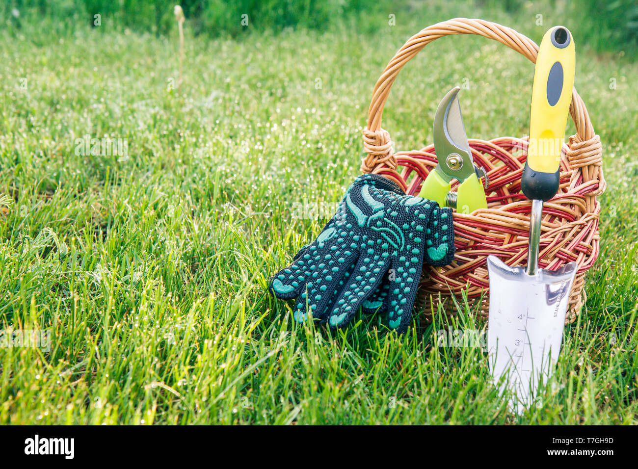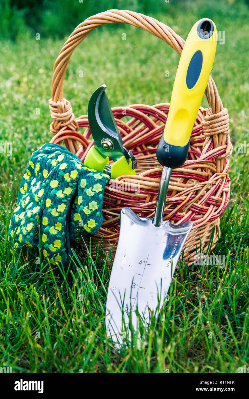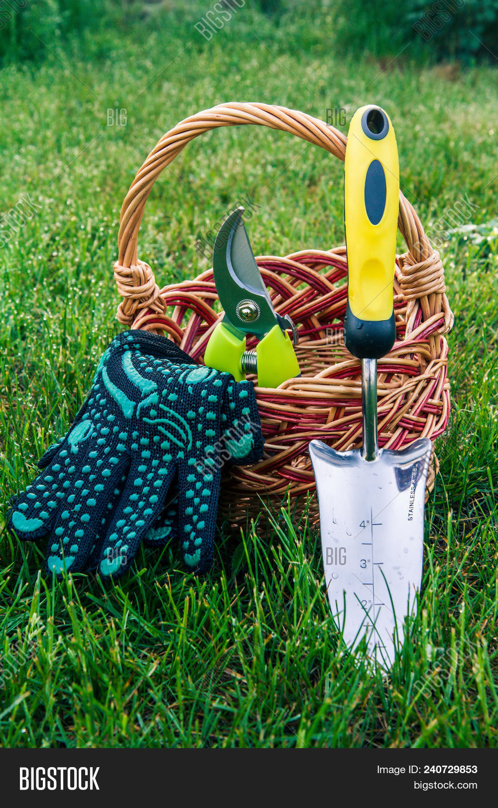 Small Hand Garden Trowel Pruner And Gloves With Wicker Basket In