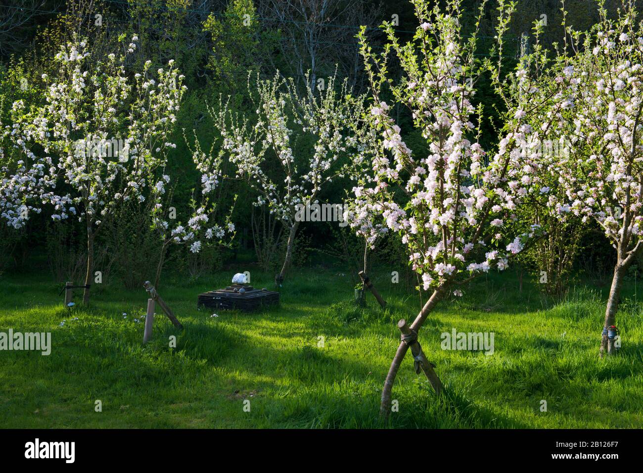 Young Half Standard Apple Trees Covered In Blossom Growing In