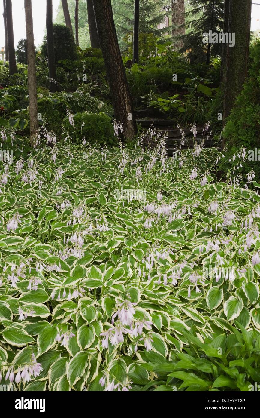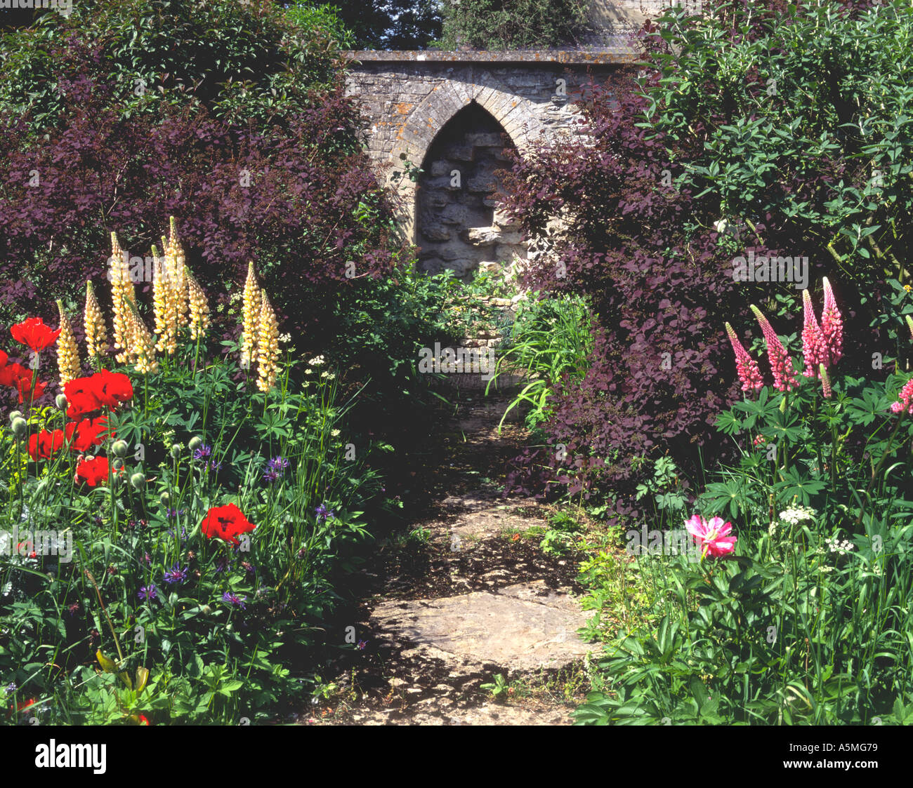 Summer Colour Garden Borders Leading To Stone Wall Feature Stock