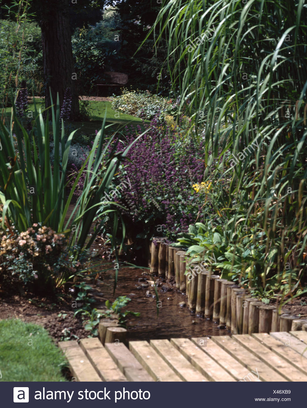 Wooden Decking Bridge Over Small Garden Stream With Wooden Edging