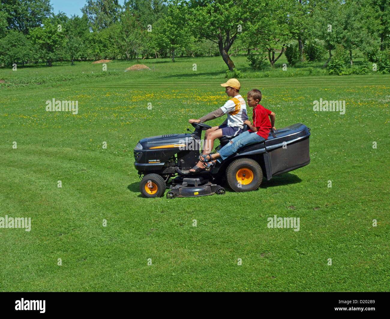Two Country Boys Cutting Grass On Field With Small Garden Tractor