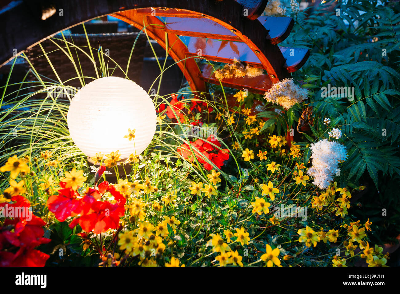 Decorative Small Garden Light Lanterns In Flower Bed In Green