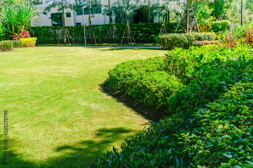Modern House With Beautiful Landscaped Front Yard Lawn And Garden