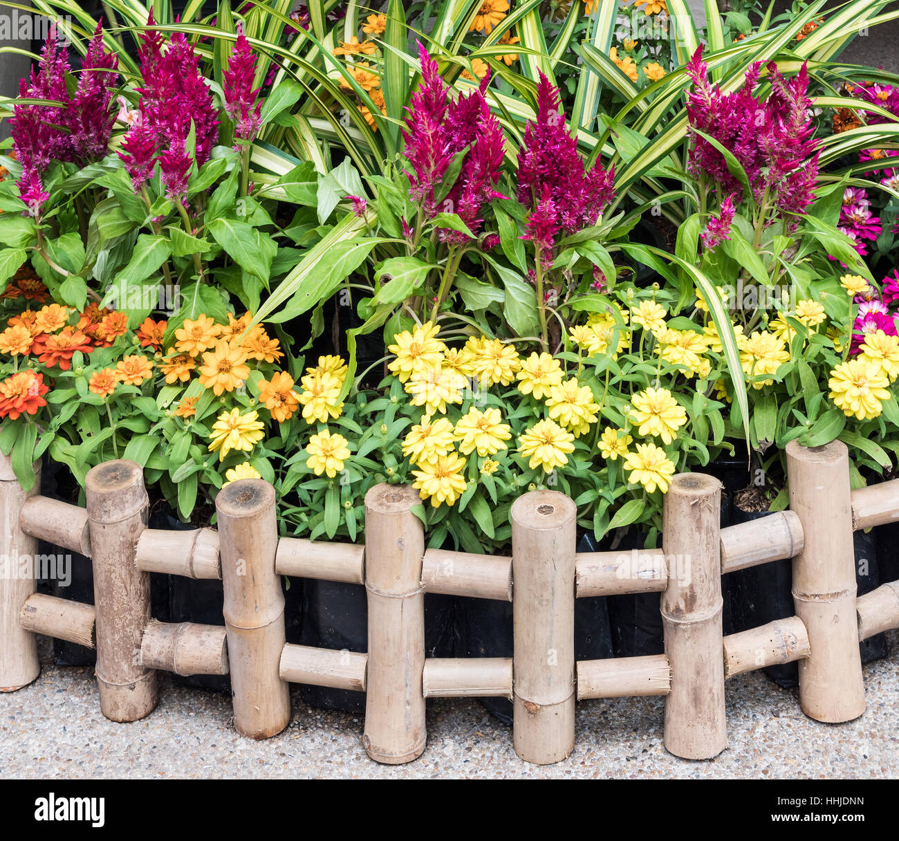 Small Garden With Red Cokckscomb In The Bamboo Fence For Decorate